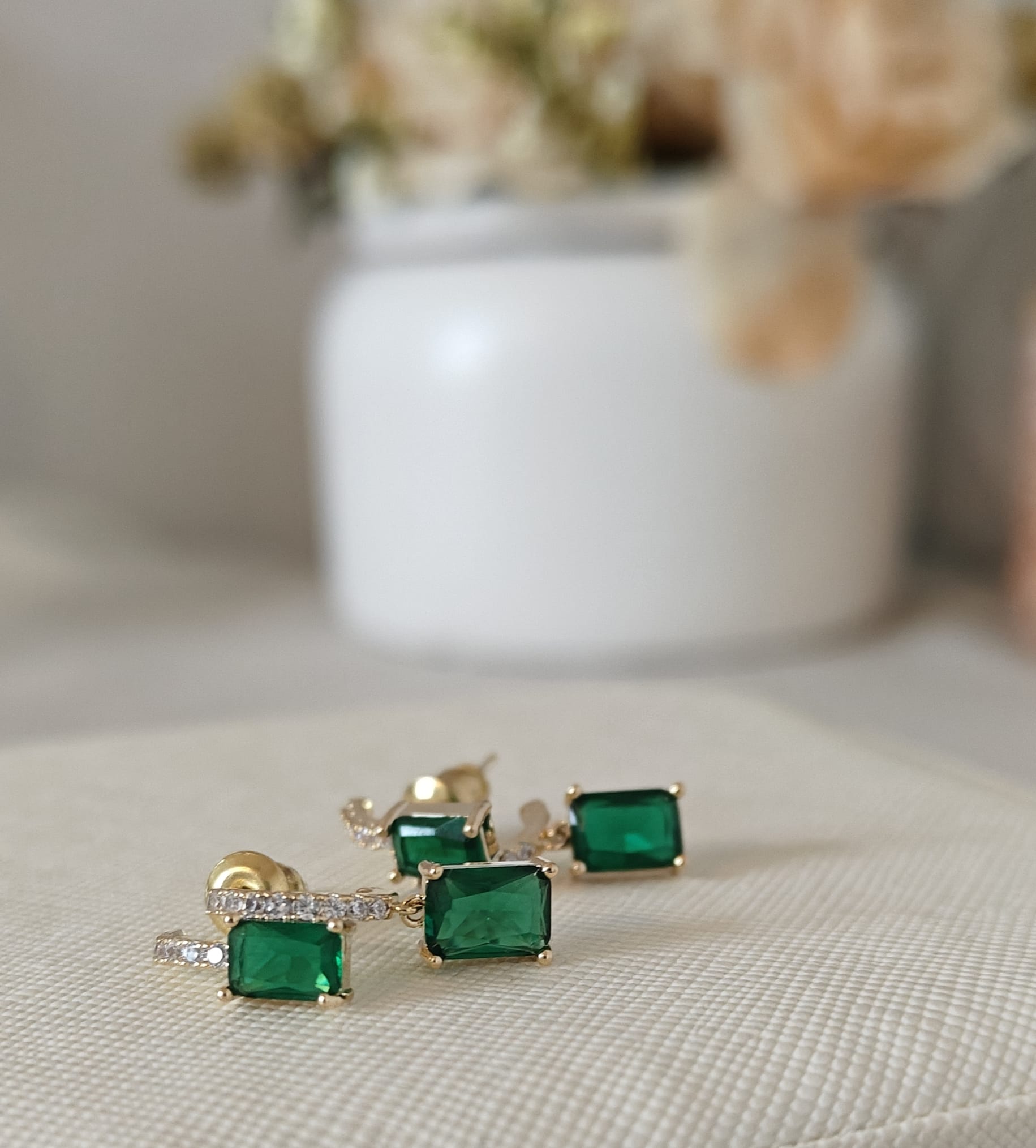 Emerald Essence – These earrings capture the true beauty of nature with their deep, captivating emerald green stones. Set in a sleek, minimalist design, the emeralds exude an aura of sophistication and luxury. The stones are carefully cut to enhance their vibrant color, catching the light with every movement. Perfect for adding a touch of elegance to both everyday looks and special occasions, Emerald Essence earrings bring timeless beauty and a pop of rich, radiant color to your jewelry collection.